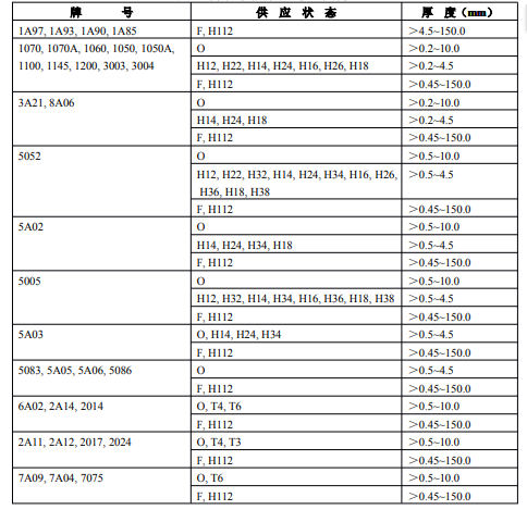 注:①1070,1070A,1060,1050,1050A,1100,1145,1200,3003,3004,3A21,8A06可供應寬度小于400mm的板材,但尺寸偏差按400mm寬度的板材檢查,當供應寬度為大于400mm至1000mm時,其尺寸偏差按1000mm寬度的板材檢查;可供應長度小于1000mm的板材,其尺寸偏差按長度為1000mm的板材檢查。